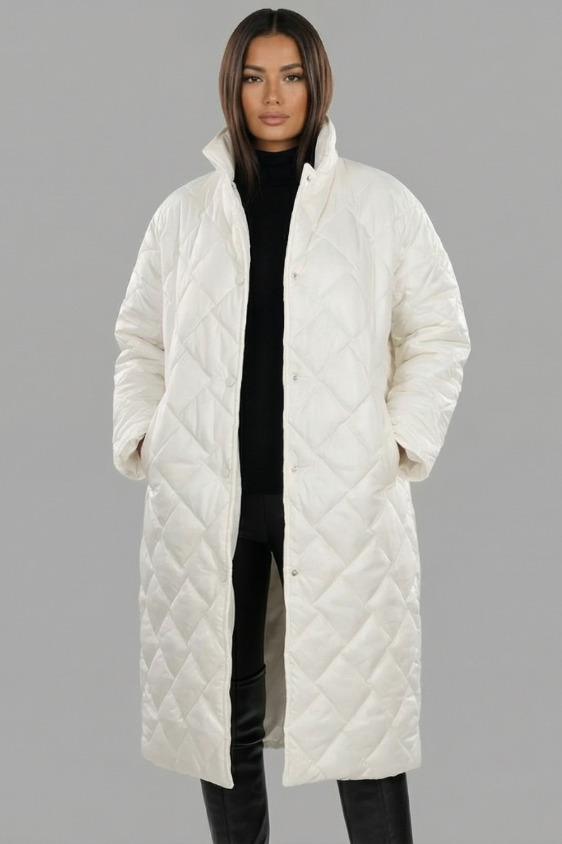This sophisticated longline puffer coat features a distinctive diamond-quilted exterior and a high-standing collar for maximum coverage. The reversible design showcases a bold leopard-print interior, allowing for two distinct looks in one high-quality garment. Front snap-button closures and deep side pockets combine functional utility with a streamlined, modern silhouette.